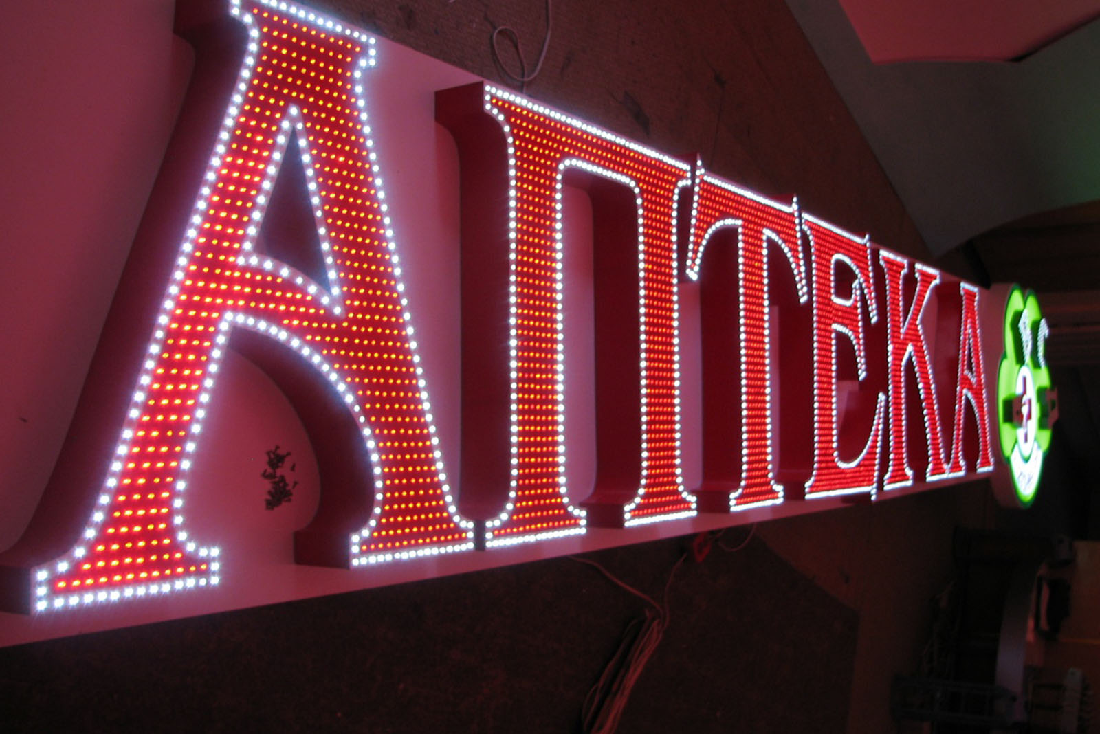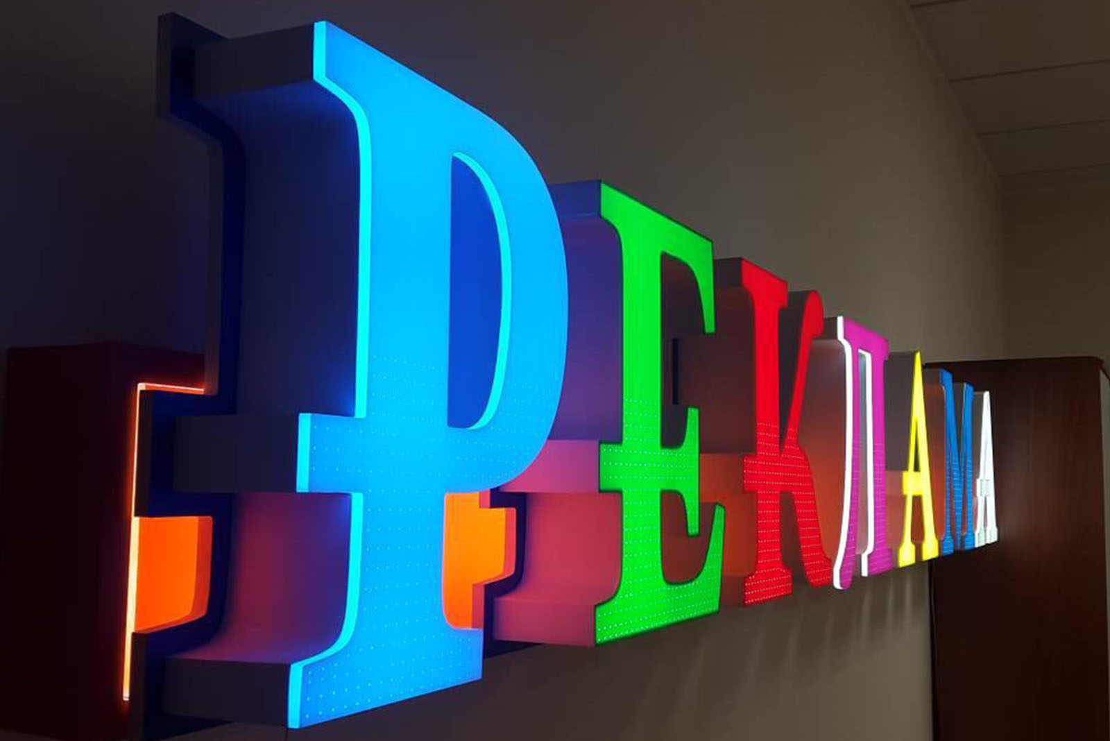 Вывески с объемными буквами и подсветкой выполняют функцию визитной карточки. Светодиодная подсветка внутри каждой буквы гарантирует идеальный просмотр в непогоду и темное время суток, что особенно актуально для торговых и развлекательных помещений.